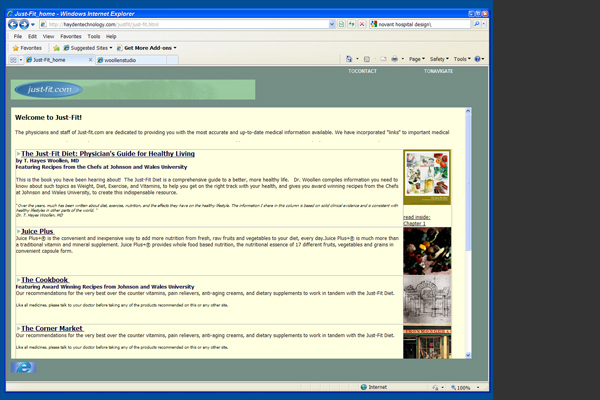The Just-Fit Diet This book and website were designed in tandem to provide a medical clinic in Charlotte, North Carolina with the ability to distribute information regarding diet and lifestyle to it's patients. The website was designed by woollen|studio to provide up to date information to patients regarding home care and prevention. The doctors of Cotswold Medical Clinic were able to use the site to provide a resource to their patients 24/7. The accompanying book, "The Just-Fit Diet", combined the pertinent information contained on the website with recipes from the chefs at Johnson and Wales University. :End |