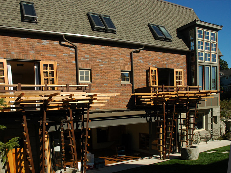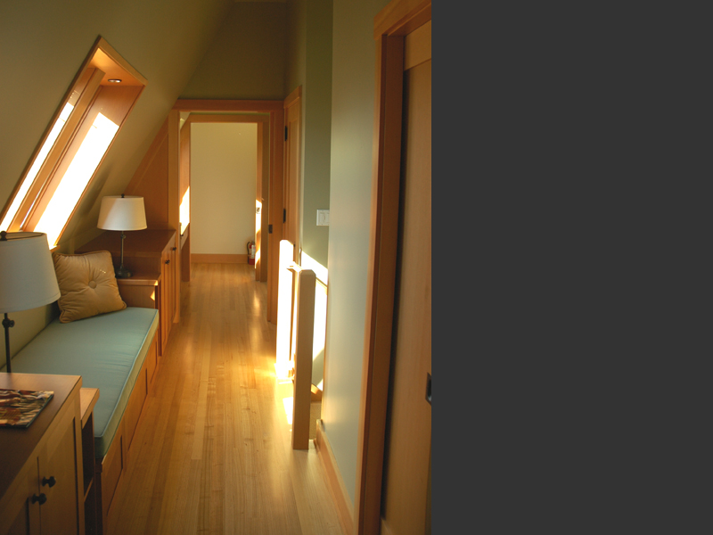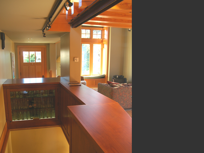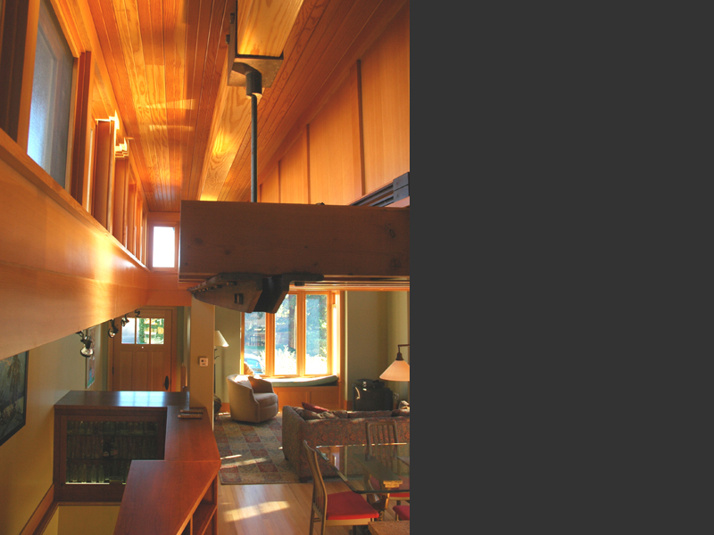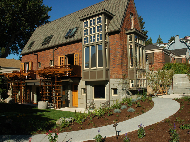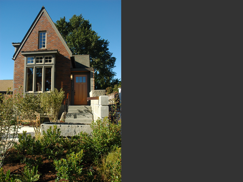 Seattle, Washington Situated on the western facing slopes of Seattle with views to the Puget Sound, this project was conceived as a guest house to be used by it's owners for out of town guests, as an exercise and office outbuilding to their existing house, and as a getaway. The small size of the existing lot suggested that building into the slope against the alley, to open up three stories to the view out to the Puget Sound. Large bay windows bring light into the double height living space, while trellises surround the balconies which open out to the garden, allowing for the capture of summer breezes. Water is a consistent theme through the building, brough down with rain chains into ancient chinese troughs located in the landscape. :End