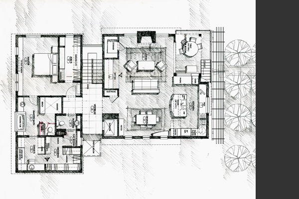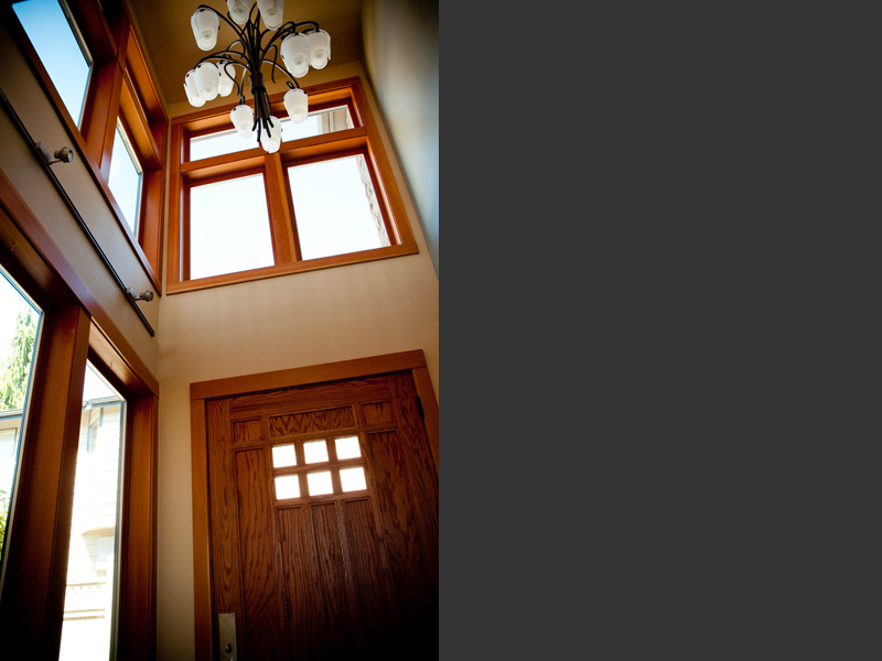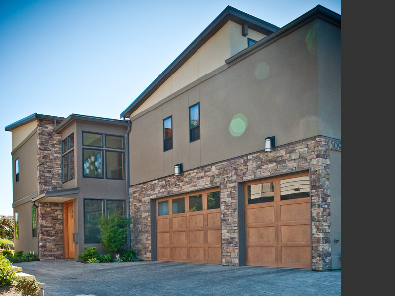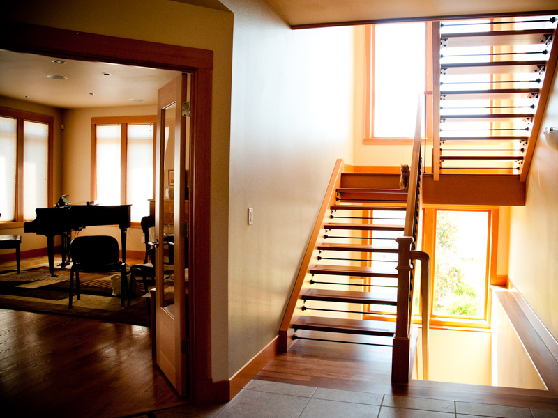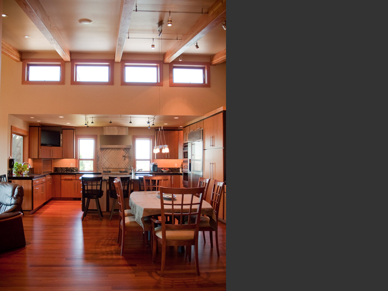 Edmonds, Washington Perched on the hillside, with a commanding view of the Puget Sound and the Olympic Mountains to the west, this contemporary residence strives to take advantage of the views, while using sustainable ideas of natural ventilation, sun shading, and simple design techniques. The open plan combines the kitchen, dining room and living room into one large space, divided from the Master wing by the stair hall, which becomes the spine of the building. Outdoor rooms are located both on the main floor, where large slide fold doors open the living room to the view, and the rooftop deck. :End