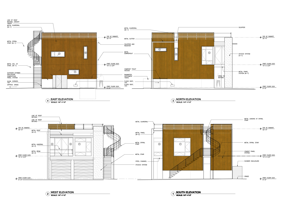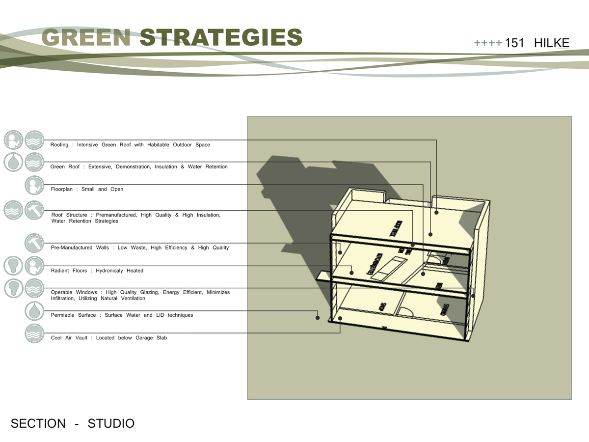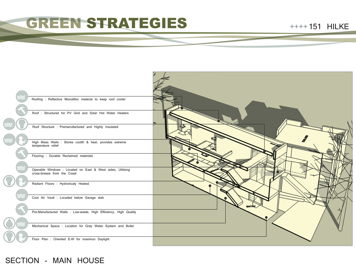 Charleston, This contemporary take on an old Charleston Row House was designed for a young couple expecting their first child. Because of the timing of the new arrival, the Carraige House was permitted and built first, while the main house is currently in the early Schematic Design Phase. Early in the process, the client, owner of a local sustainable consulting and construction firm, Hilke Development, was interested in showcasing sustainable ideas that he was a proponent of on his own projects. Among other things, a Water Catchment System takes water from the Green Roof to be used for irrigation, Solar Thermal Panels supplement the hot water heating, Photovoltaic Panels supplement the electrical usage, and Natural Ventilation is supplemented with cool air shafts from under the concrete slab. The structural system is largely SIP panels, which allowed for fast erection times and reduced framing costs, with higher insulation values and less construction waste than traditional framing. The client found recycled windows and used recycled composite countertop materials. See a video of the exterior stair erection here.