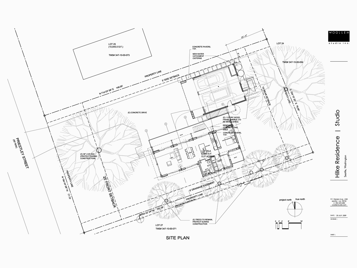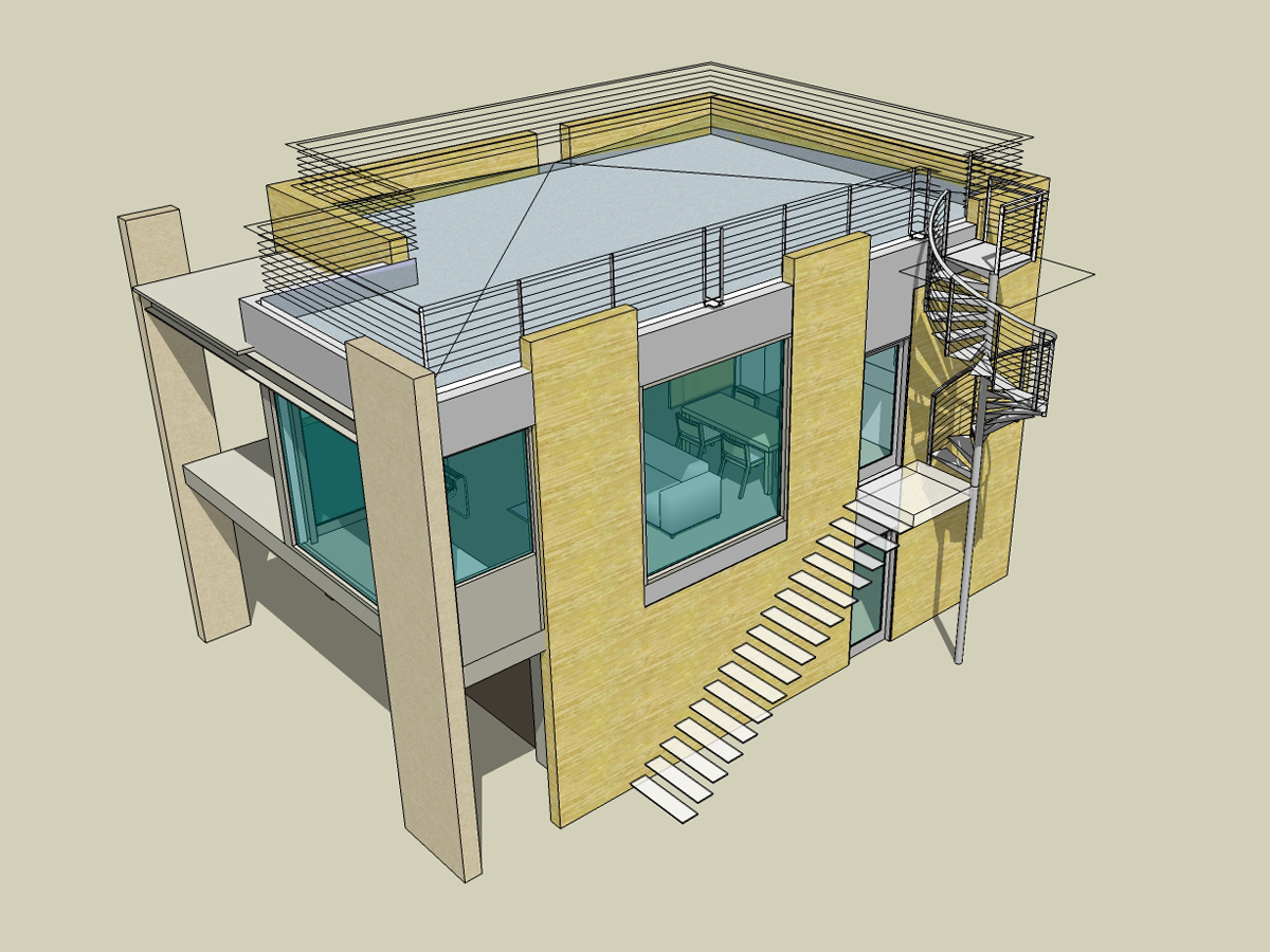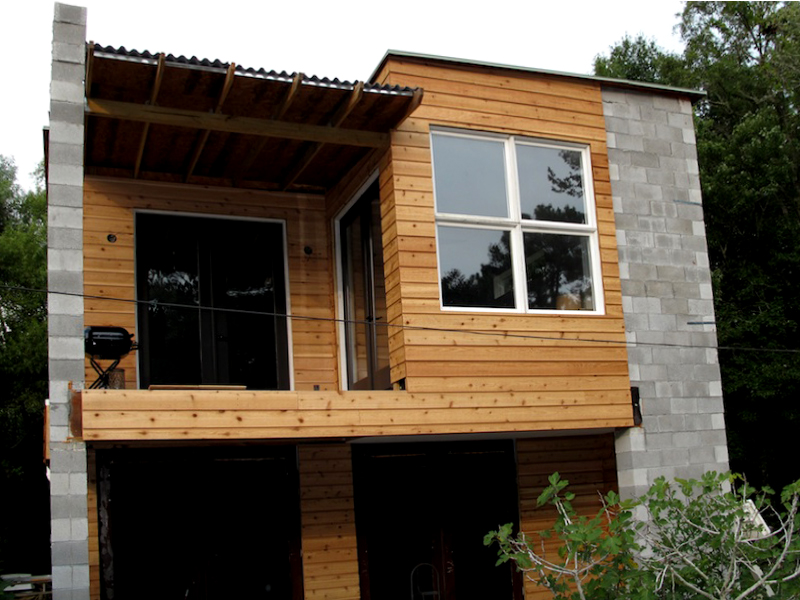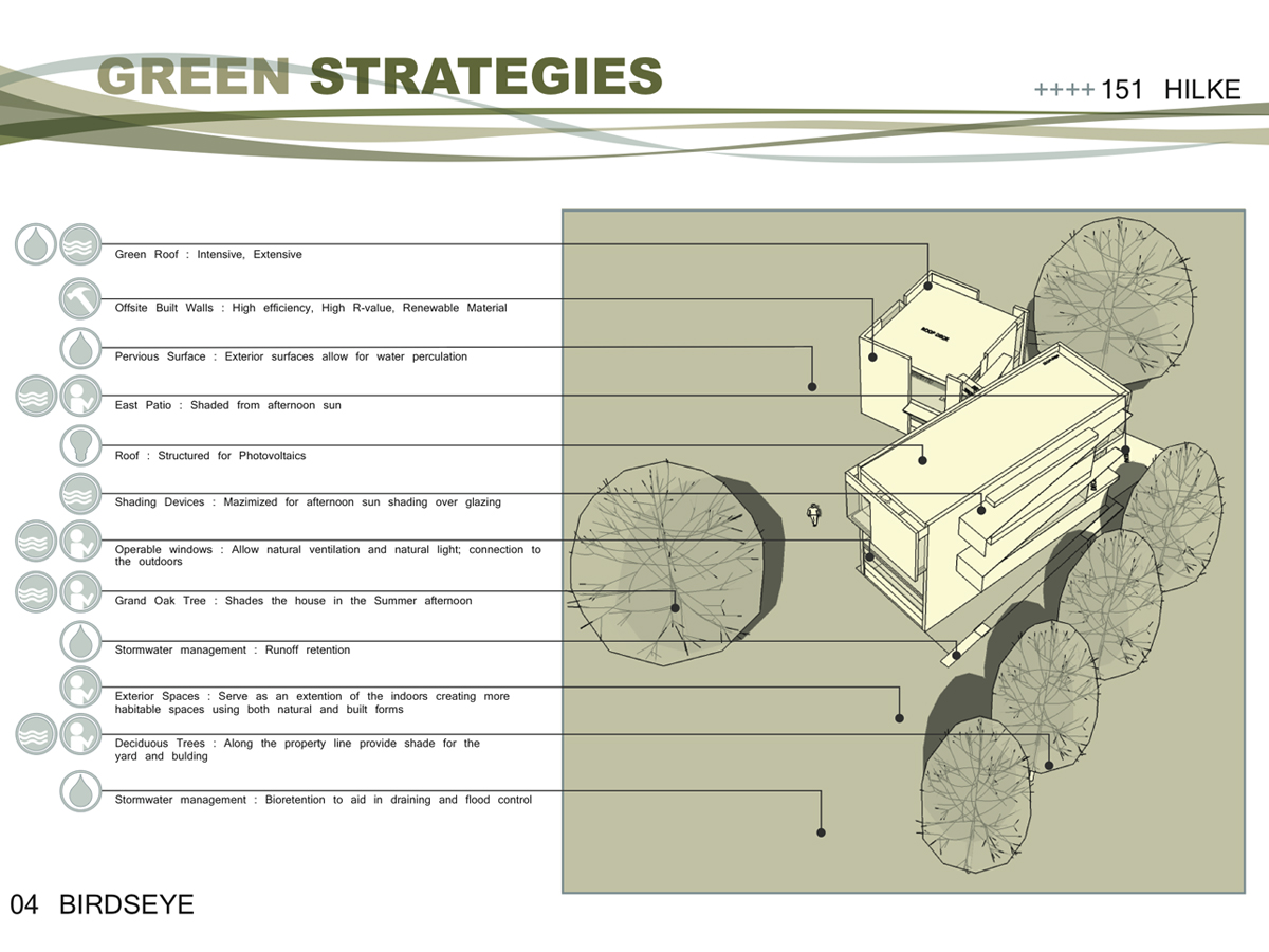 Charleston, This contemporary take on an old Charleston Row House was designed for a young couple expecting their first child. Because of the timing of the new arrival, the Carraige House was permitted and built first, while the main house is currently in the early Schematic Design Phase. Early in the process, the client, owner of a local sustainable consulting and construction firm, Hilke Development, was interested in showcasing sustainable ideas that he was a proponent of on his own projects. Among other things, a Water Catchment System takes water from the Green Roof to be used for irrigation, Solar Thermal Panels supplement the hot water heating, Photovoltaic Panels supplement the electrical usage, and Natural Ventilation is supplemented with cool air shafts from under the concrete slab. The structural system is largely SIP panels, which allowed for fast erection times and reduced framing costs, with higher insulation values and less construction waste than traditional framing. The client found recycled windows and used recycled composite countertop materials. See a video of the exterior stair erection here.