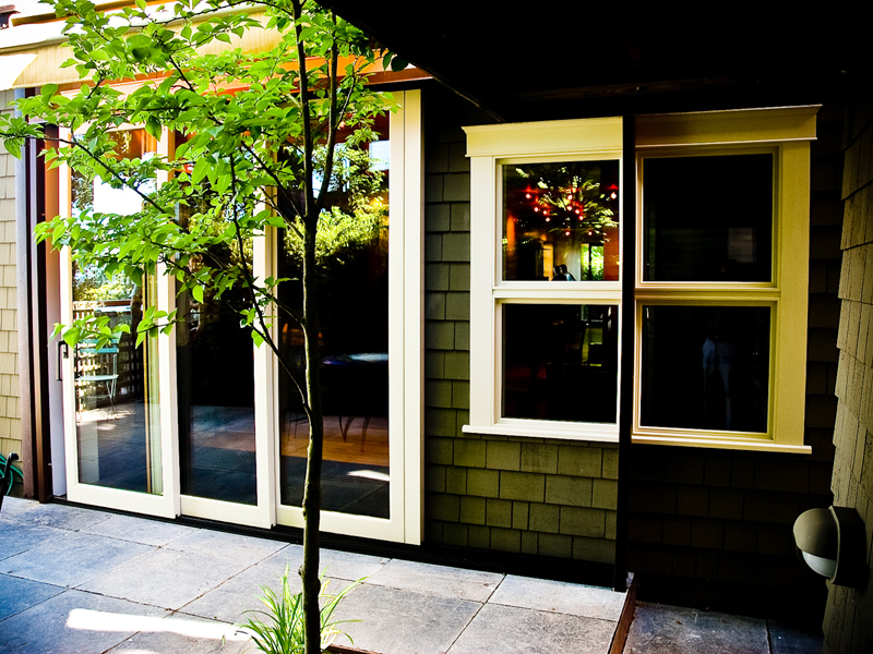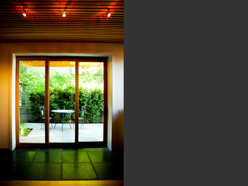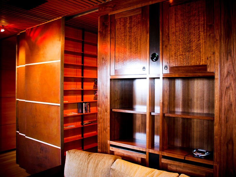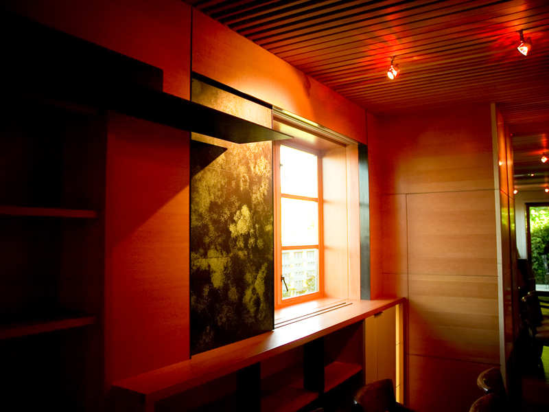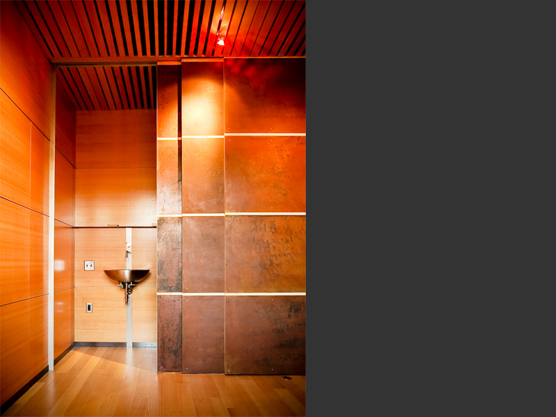 | Seattle, Washington  This project centers around the remodel of the daylight basement of a contemporary Queen Anne Residence, overlooking the Puget Sound. The clients wanted to have a home theater, game room, exercise room, and entertainment room designed within an exisiting shell. Walking through the grove of Aspens to the front door creates a progression to the house through nature, softening the exterior of the house and providing a Northwest garden. The large steel panels of in the new interior space can be opened or closed to completely change the function of the space. Sliding copper panels are designed to slide in front of the windows to darken the room for movies. The irregular pattern of the ceiling optimizes the sound quality of the room by targeting specific wavelengths of sound. |